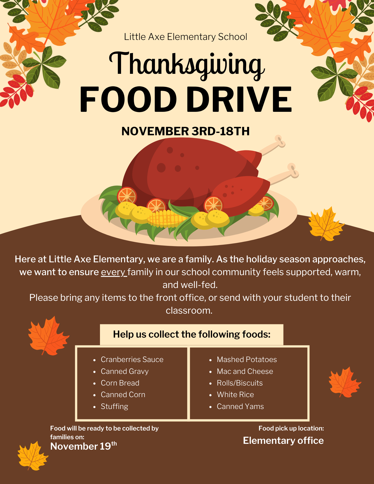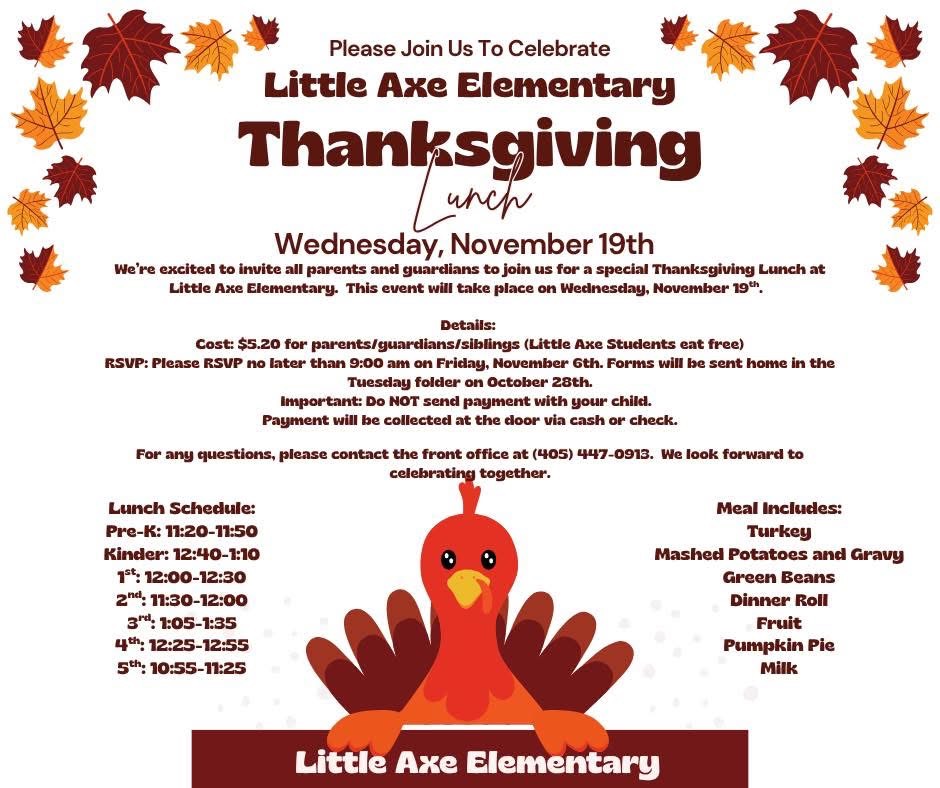 You also can't forget about our Thanksgiving lunch feast! If you have RSVP'd to attend, the luncheon is on Wednesday, November 19th during your students lunch times. Pictured below will be lunch times for students during that day. We hope to see you there!